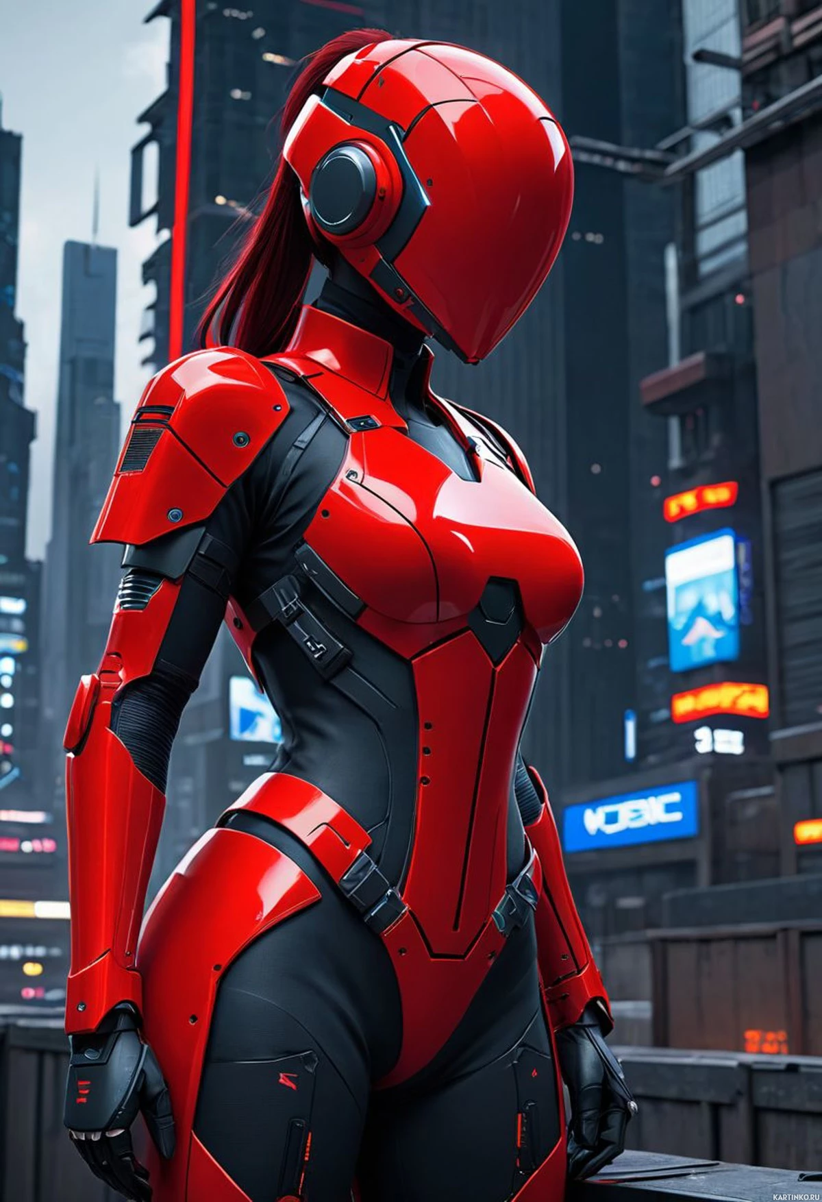 Картинка изображает женщину-персонажа в футуристической броне, преимущественно красного и черного цвета, с механическими деталями. Шлем выполнен в стиле визора, что указывает на высокотехнологичный или научно-фантастический сеттинг. Единственная видимая человеческая черта – её лицо, резко контрастирует с роботизированным видом остальной экипировки. Фон намекает на городскую среду с неоновыми огнями и горизонтом, характерным для эпохи киберпанка или передовых технологий.