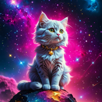 The image features a white cat with long fur, sitting upright on what appears to be a rock. The background has a vivid cosmic theme with purple and blue hues, suggesting the vastness of space. There are stars scattered across the sky and clouds that resemble nebulas, further enhancing the celestial atmosphere. A bright light source emanates from the top left corner, contributing to the overall luminosity of the image. The style of the artwork is illustrative with a digital painting quality to it.