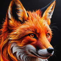 На картинке изображена лиса, окрашенная в яркие, насыщенные оттенки красного и желтого на фоне темного пространства. Лиса смотрит прямо на зрителя с чуть приоткрытым ртом, словно рычит или ощеривается. У нее заметные белые усы и настороженные уши. Шерсть прорисована с высокой детализацией, видны отдельные волоски разной длины и фактуры, что придает животному реалистичный вид.
