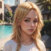 a casual top and sunglasses adorning her attire. In the background, there are buildings that resemble quaint European architecture, including a church with a pointed roof, and a clear