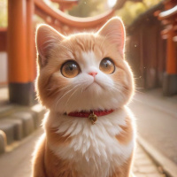 In this image, there's a light orange kitten with white paws and chest. The kitten has large blue eyes and is sitting on what appears to be cobblestone pavement, possibly in an outdoor setting with wooden structures nearby that could suggest a traditional Japanese architecture style. The sunlight seems to be filtering through the scene, indicating it might be early morning or late afternoon due to the soft lighting conditions.