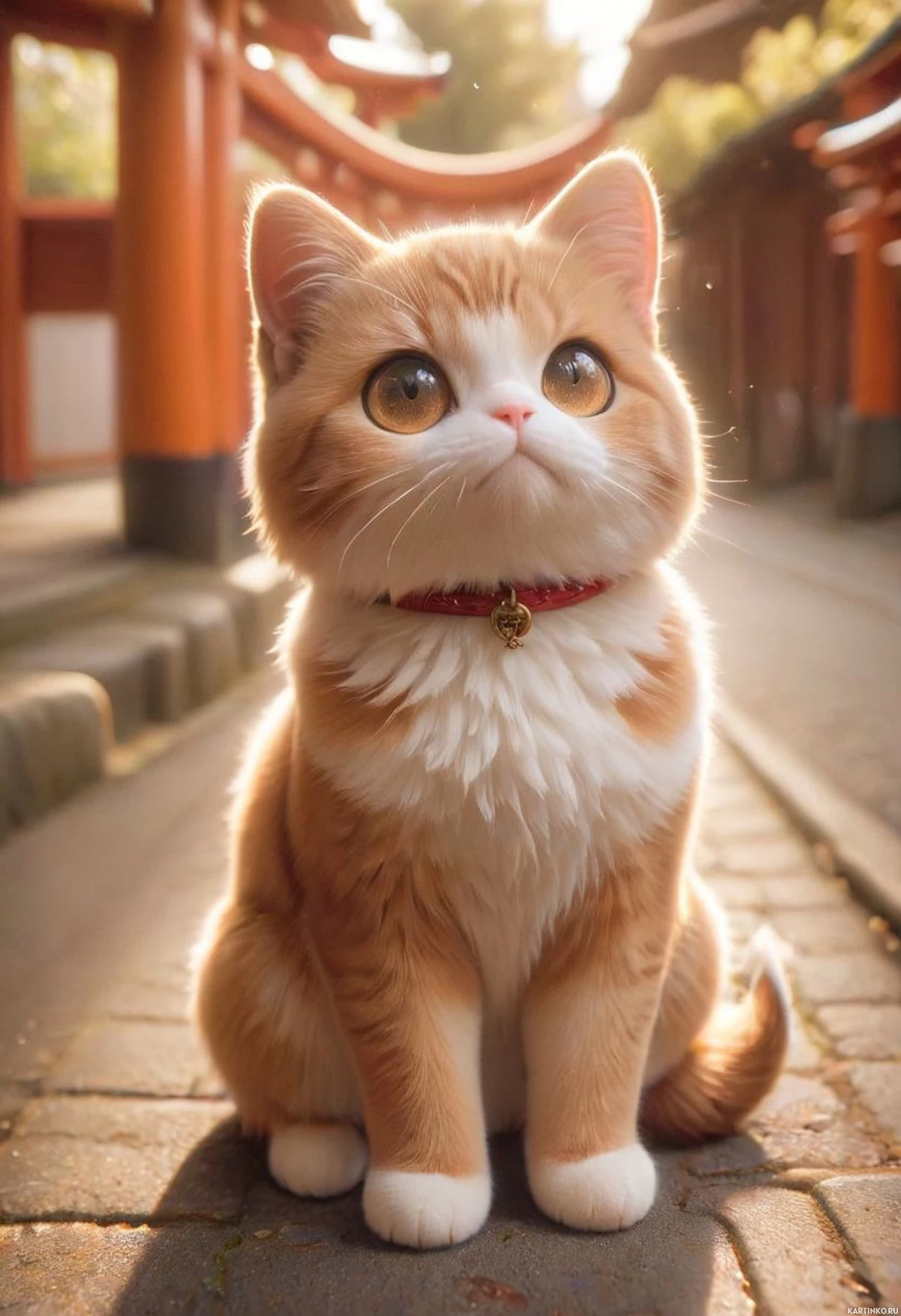На картинке — светло-рыжий котенок с белыми лапками и грудкой. У него большие голубые глаза, а он сидит на булыжнике, возможно, на улице, рядом с деревянными постройками, напоминающими традиционную японскую архитектуру. Солнечный свет мягко проникает в сцену, что говорит о раннем утре или позднем вечере.
