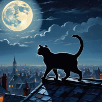 The image features a black cat perched on the roof of a building under a full moon. In the background, there's a silhouette of a city skyline at night with multiple spires and steeples visible against a darkened sky.