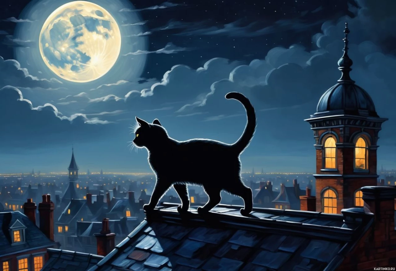 На картинке – черный кот, примостившийся на крыше здания под полной луной. На заднем плане виден силуэт ночного городского пейзажа с множеством шпилей и башен на фоне темного неба.