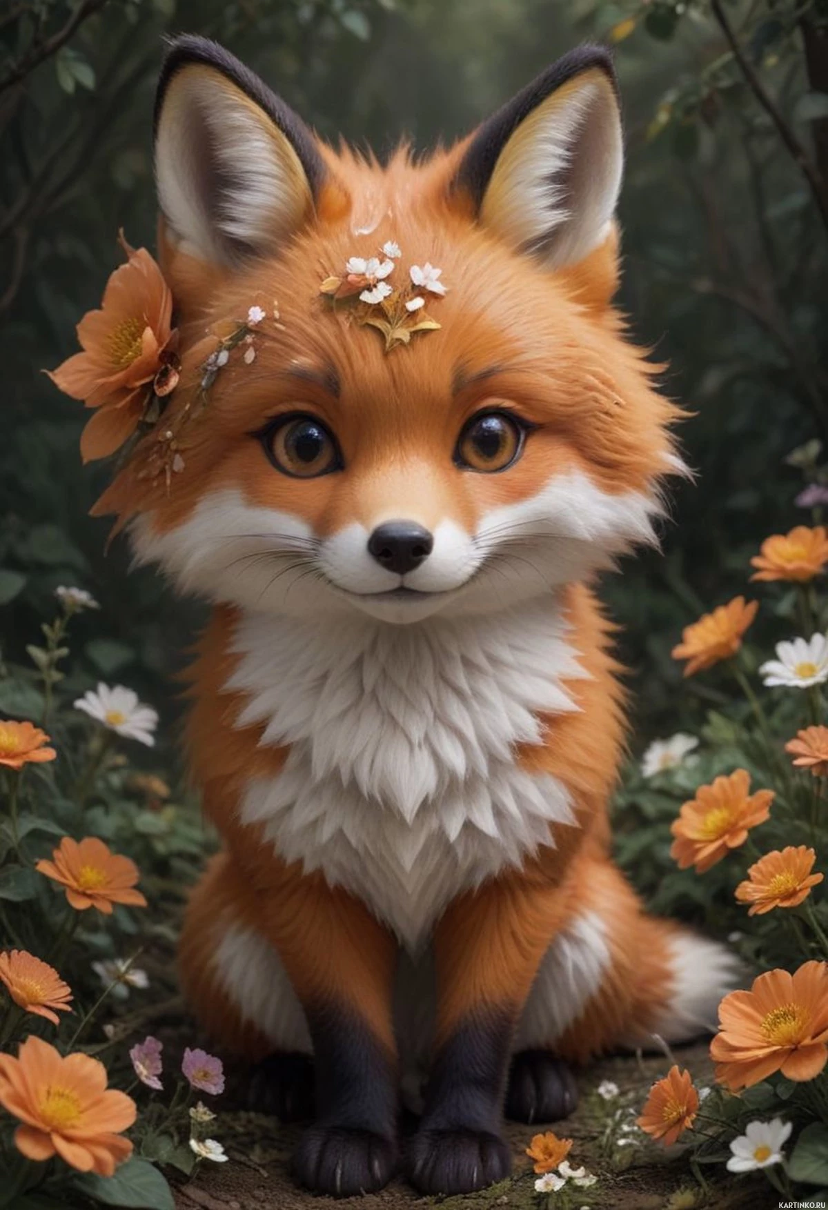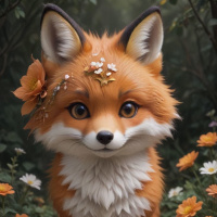 The image depicts an animated fox in a serene setting. The fox has prominent orange and white fur, with large perked-up ears typical of the species. It is seated among vibrant flowers with petals that resemble red geraniums and yellow daisies, set against a backdrop that suggests a forest or garden during twilight. The fox's expression is one of calmness and contentment, with its eyes gently closed as if enjoying the peaceful surroundings.