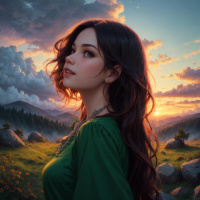 the warm hues of the sky behind her. In the background, there are silhouettes of trees and the outline of mountains under