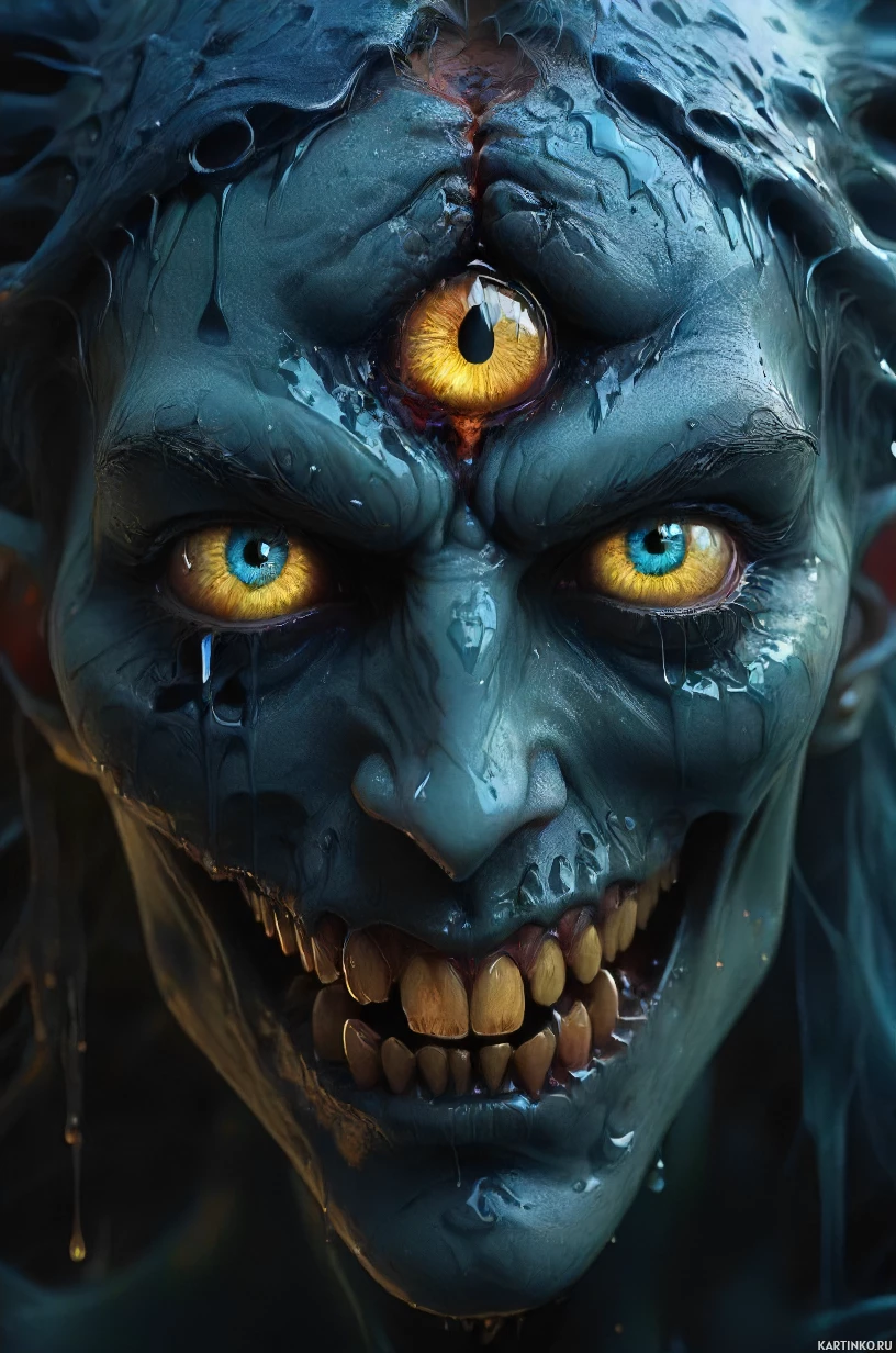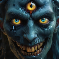 На картинке изображён персонаж в жанре фэнтези-хоррора, главным элементом которого является глаз. У персонажа демоническая внешность: бледная кожа, заострённые уши, что указывает на нечеловеческую природу, характерную для этого жанра. Глаз, расположенный в центре лица, кажется светящимся, что добавляет жутковатой атмосферы, свойственной хоррорам. Персонаж также изображён со злобным, безумным смехом, что ещё больше подчёркивает ужас на картинке. Окружающая обстановка тёмная и загадочная, усиливающая общее потустороннее и тревожное впечатление.