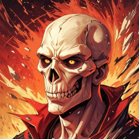 The image features a stylized depiction of a character's head with flames emanating from the back, suggesting intense heat or power. The head appears to be that of a skeletal figure with glowing red eyes and a menacing expression. Surrounding the skull are flames in various shades of orange and yellow, contributing to the fiery theme. The style of the artwork has a graphic design quality, with bold lines and vivid colors that convey a sense of drama and perhaps a narrative element related to fire or power.