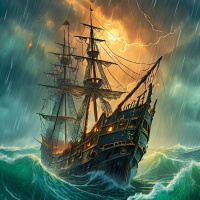 Картинка изображает драматичную сцену шторма в море, на переднем плане — корабль. У корабля мачты и паруса, что указывает на его старинность. Небо затянуто тёмными тучами, а молнии освещают сцену сверху. Вода выглядит неспокойной, с волнами, разбивающимися вокруг корабля.
