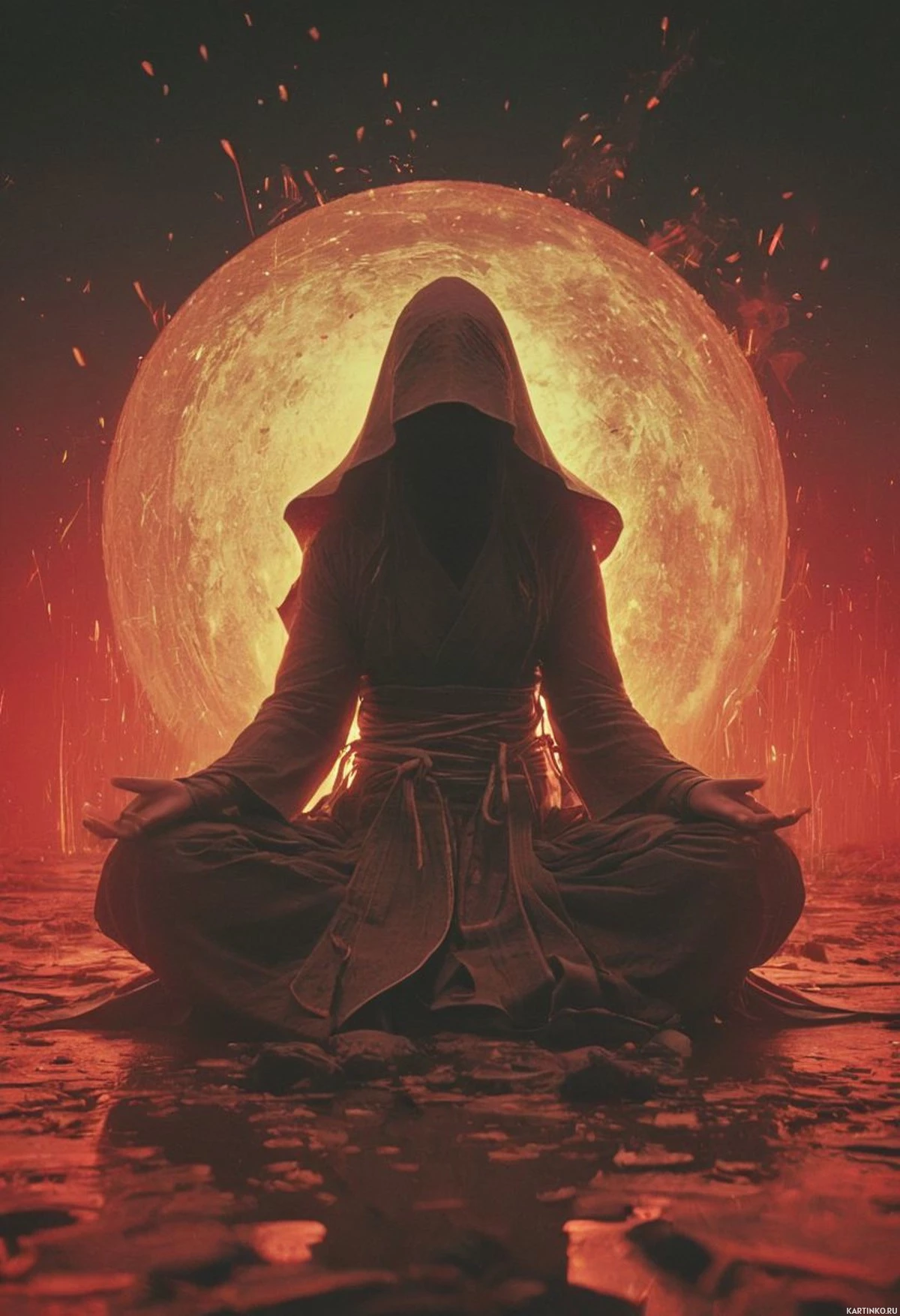На картинке фигура, скрытая в тени, сидит на потрескавшейся земле под багровой луной. Поза человека располагает к созерцанию, руки сложены перед ним, создавая ощущение сосредоточенности. Вокруг фигуры бушуют языки пламени, похожие на лаву, что добавляет сцене напряженной атмосферы. Место действия кажется нереальным, с элементами, противоречащими законам природы, например, луна затмевается светом солнца, создавая драматичное небо.