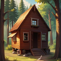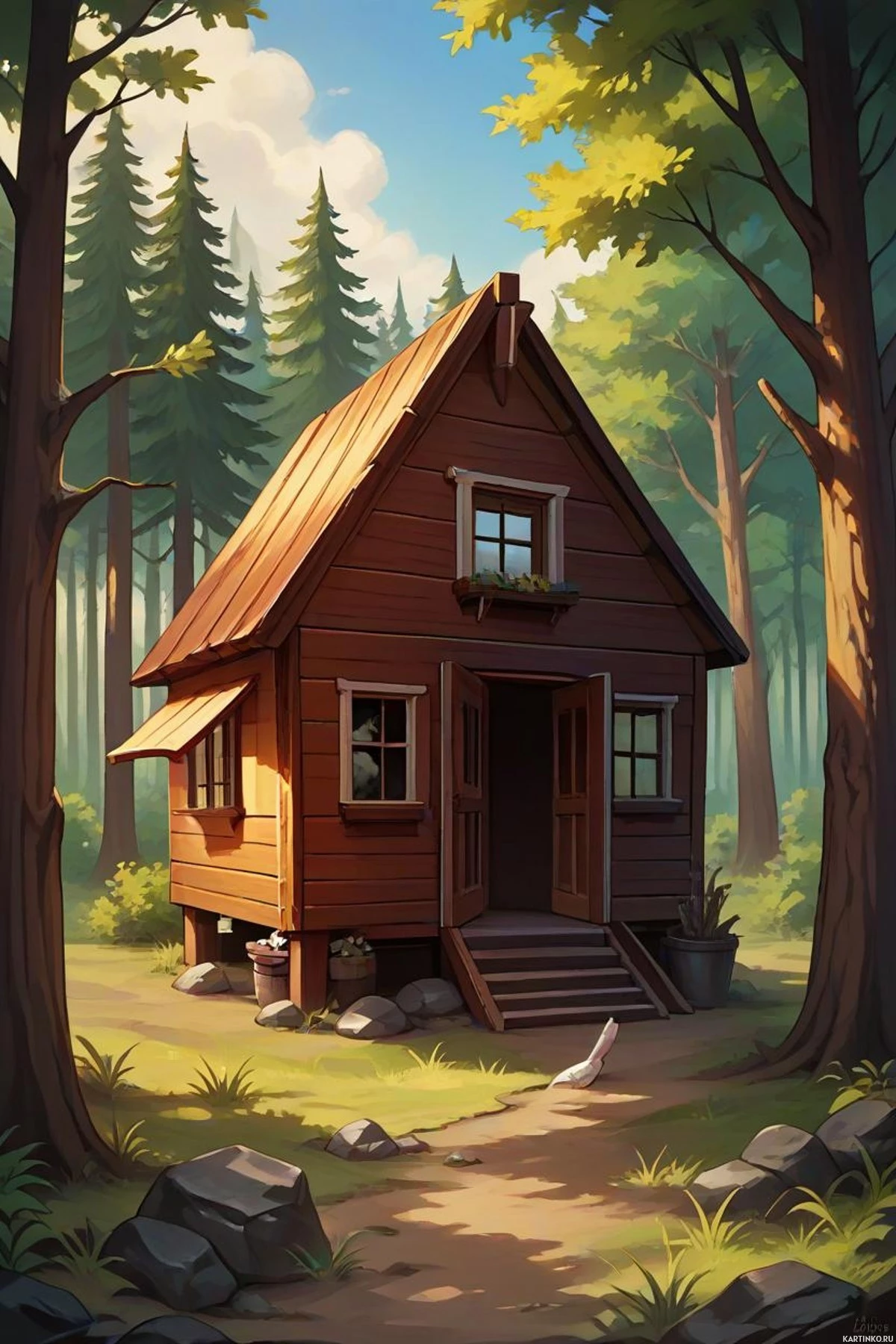 Картинка изображает уютную, деревенскую избушку, спрятанную в лесу. У неё покатистая крыша, и она построена из деревянных досок. На фасаде дома видны два окна: одно над дверью, а другое прямо под ней. Из крыши торчит небольшой дымоход. К входу в избушку ведёт лестница, ведущая к закрытой двери. Слева от избушки стоит дерево с большими раскидистыми ветвями, частично скрывающими здание. Лес, окружающий избушку, густой и зелёный, с высокими деревьями и разнообразной растительностью. Небо над головой частично облачное, что говорит о пасмурном дне. Вся сцена передаёт спокойную, природную атмосферу.