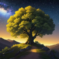 The image depicts a vibrant scene featuring a tree prominently in the foreground. This tree has a full, round canopy with lush green leaves and is illuminated from the top by what appears to be a warm glow, possibly from the sun setting or rising. Behind the tree, there are majestic mountains that fade into the distance under a clear night sky. The landscape suggests a tranquil environment, possibly a valley or a mountain pass. The overall composition gives the impression of a serene and idyllic natural setting.