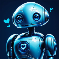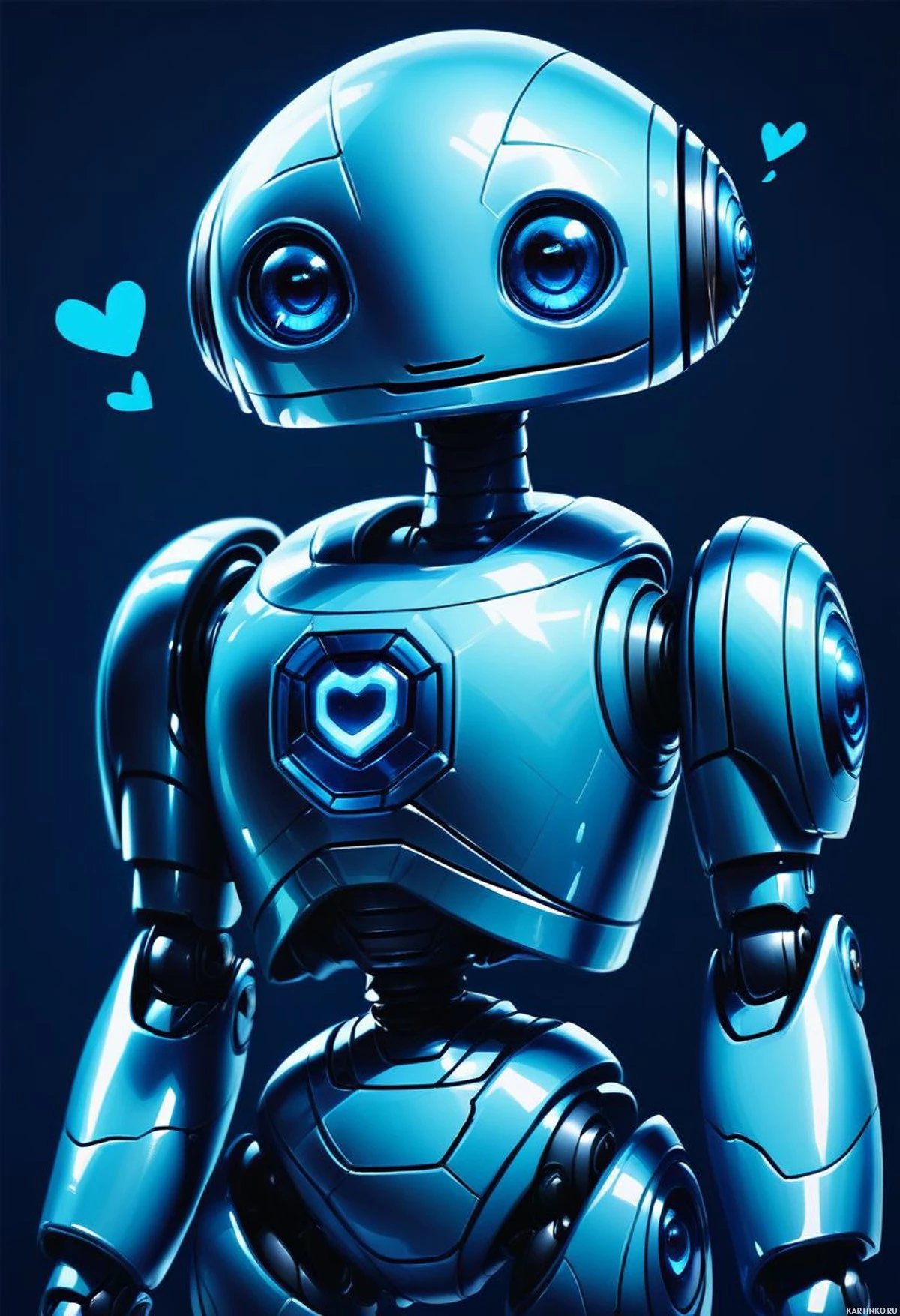 На картинке изображен гуманоидный робот с преимущественно синим металлическим корпусом, включая голову, торс, руки и ноги. У него пара глаз с голубым свечением. Робот стоит на фоне темного пространства, что создает контраст с его светлыми оттенками.