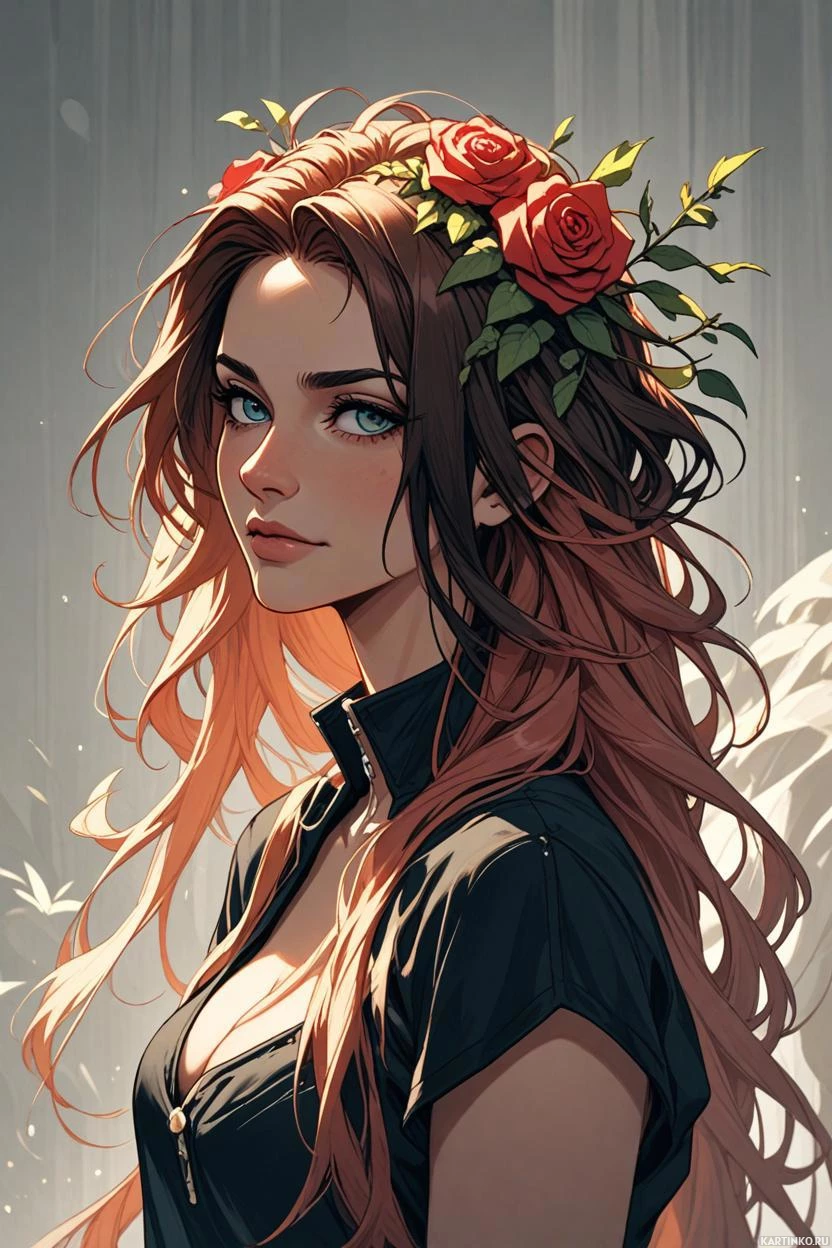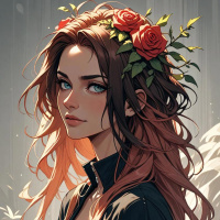 На картинке изображена стилизованный персонаж, похоже, молодая женщина с рыжими волосами и светлой кожей. У неё большие, выразительные глаза, и на ней, кажется, чёрная кожаная куртка. На голове у неё небольшая цветочная композиция, возможно, венок или украшение, с красными цветами. Фон тёмный и мрачный, создающий драматическую или напряжённую атмосферу. Персонаж смотрит прямо на зрителя с нейтральным выражением лица.
