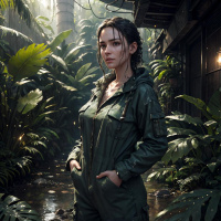 green jacket with epaulettes, cargo pants, and boots. The environment around her appears lush with foliage and there are