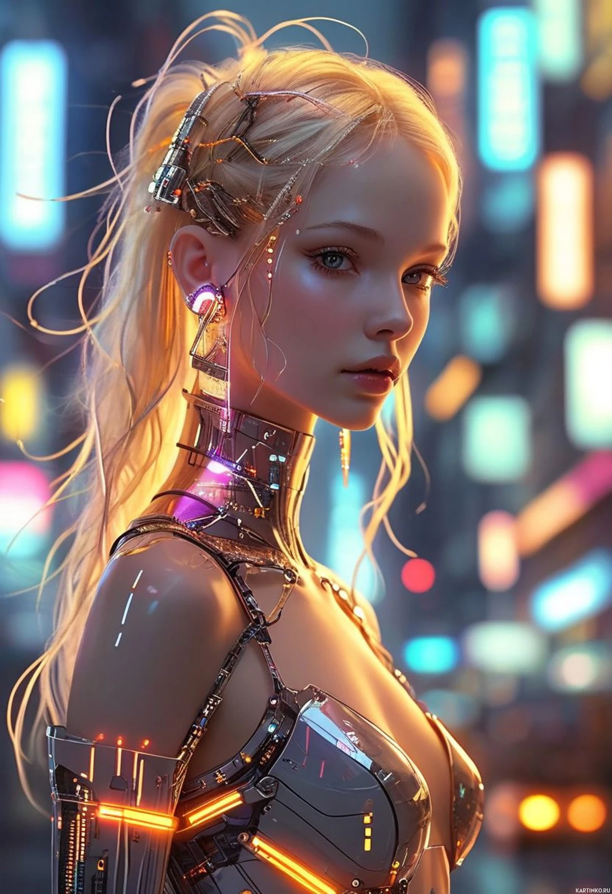 На картинке изображена женщина в научно-фантастическом сеттинге. У неё длинные светлые волосы, и она одета в футуристическую броню, словно сделанную из металла с подсвечивающимися деталями, что указывает на высокотехнологичный дизайн. На заднем плане – городской пейзаж, напоминающий неоновую улицу ночного города, создающий научно-фантастическую атмосферу картинки.