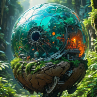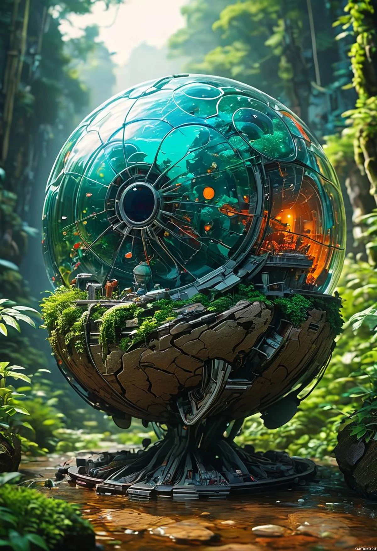 Картинка изображает фантастическую сцену, в центре которой — огромный кристаллический шар. Внутри шара, кажется, находится миниатюрный мир или модель ландшафта, с маленькими фигурками, которые могут представлять людей или существ. Шар покоится на конструкции, похожей на каменный постамент, а наверху есть круглое отверстие, из которого, кажется, исходит свет, возможно, указывающее на источник энергии или просветления. Окружающий пейзаж утопает в зелени, что говорит о природной среде, возможно, внутри пещеры или грота. Листва имеет яркий зеленый оттенок, что свидетельствует о её жизнеспособности и процветании. Стиль картинки напоминает научно-фантастические жанры, где распространены мотивы передовых технологий и потусторонних явлений. Уровень детализации указывает на высококачественную цифровую графику, возможно, предназначенную для использования в играх, фильмах или как самостоятельное произведение концептуального искусства.