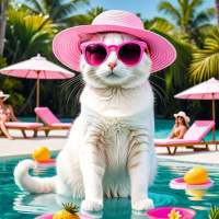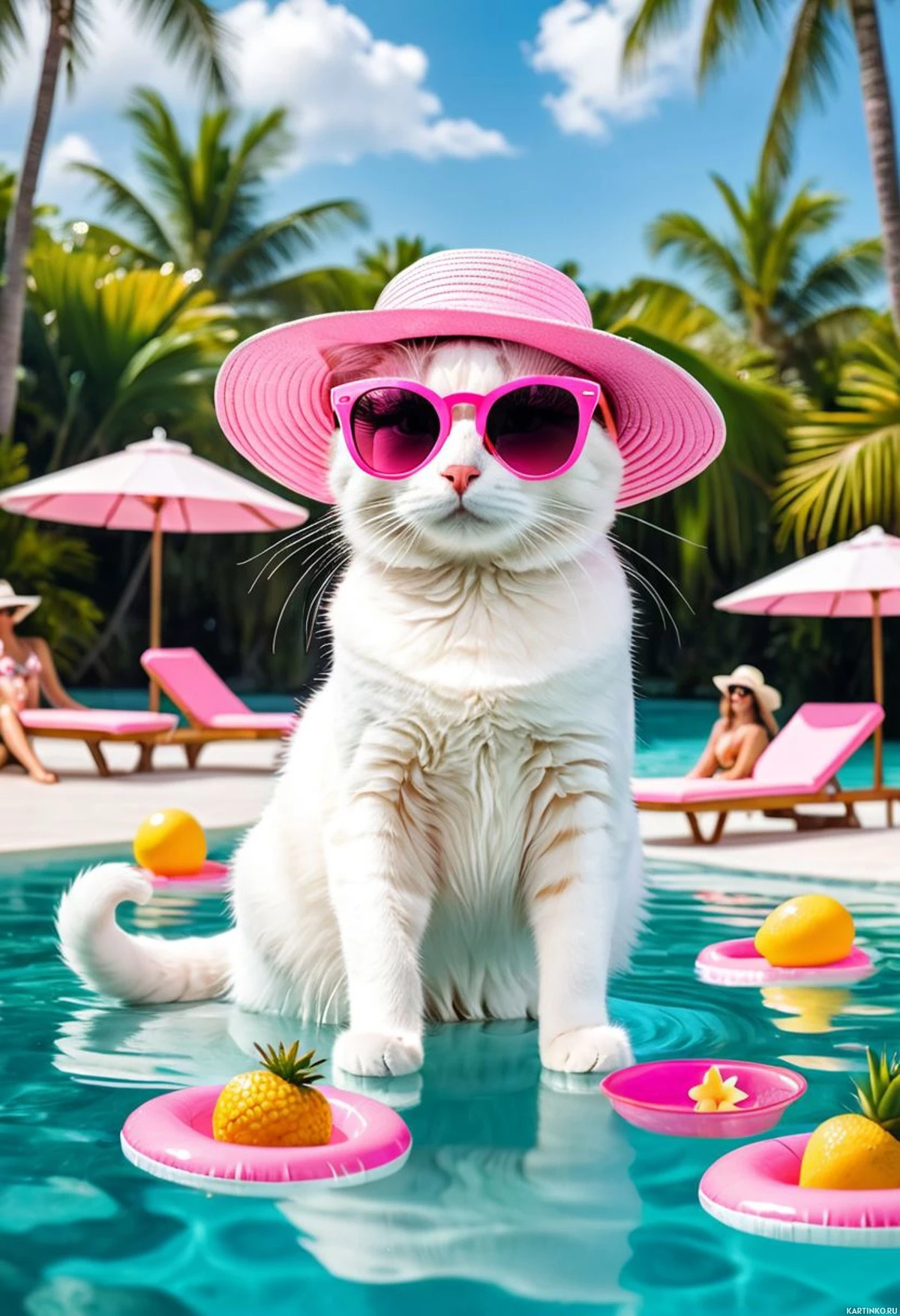 На картинке – белый кот в солнцезащитных очках и розовой шляпе, украшенной розовыми цветами, сидит на оранжевом круге для плавания в бассейне с голубой водой. Вокруг кота – другие оранжевые круги. На заднем плане – солнечное небо и пальмы.