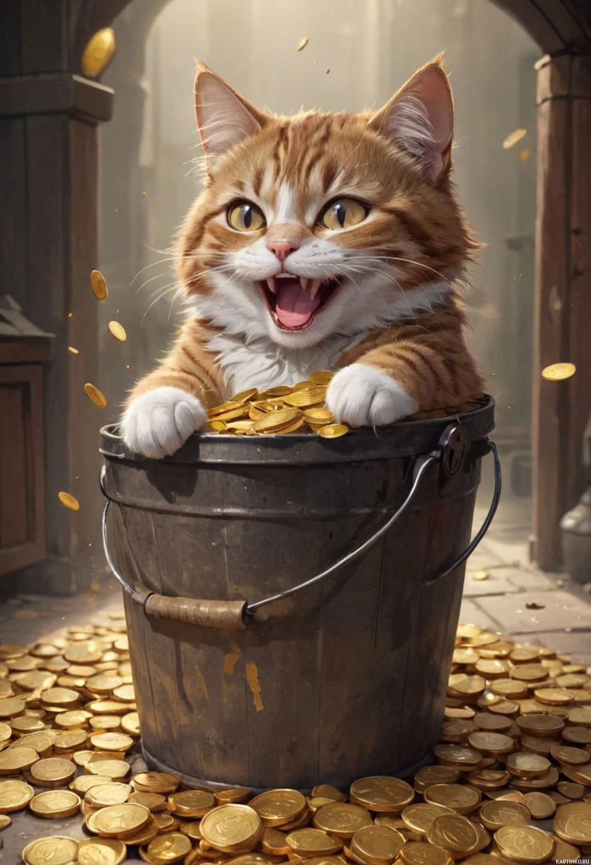 Милый кот и падающие сверху монеты