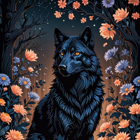 The image features a highly detailed illustration of a wolf sitting amidst a backdrop that appears to be nighttime with stars in the sky and silhouettes of trees. The wolf is depicted in a realistic style with intricate fur textures, showcasing an intense gaze with its eyes wide open. Around the central figure are flowers with vibrant colors like purples, blues, and oranges, which stand out against the dark background. These floral elements are symmetrically arranged on either side of the wolf, creating a balanced composition. The overall tone of the image is somewhat moody and mysterious due to the night setting and the surrounding vegetation's silhouettes.