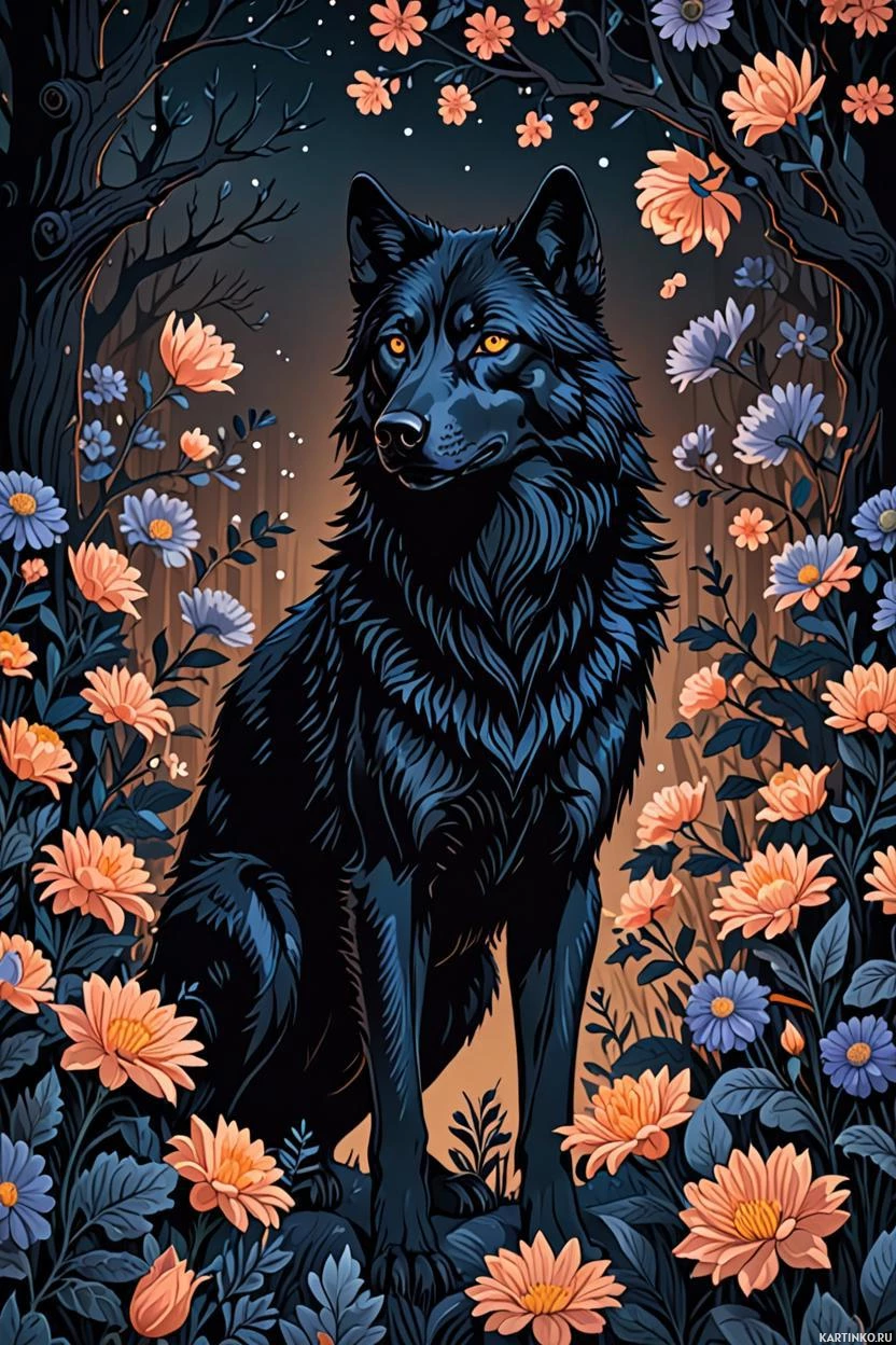 На картинке представлен детализированный рисунок волка, сидящего на фоне ночного пейзажа: на небе звезды, а на заднем плане видны силуэты деревьев. Волк изображён в реалистичной манере, с проработанной текстурой шерсти и пронзительным взглядом, глаза широко открыты. Вокруг центральной фигуры расположены цветы ярких оттенков – фиолетового, синего и оранжевого, выделяющиеся на тёмном фоне. Эти цветочные элементы симметрично расположены по обе стороны от волка, создавая сбалансированную композицию. Общая атмосфера картинки – несколько мрачная и таинственная, благодаря ночному освещению и силуэтам растительности.