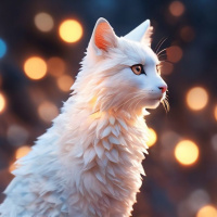 На картинке — белоснежный пушистый кот, сидящий на камне в сказочной обстановке. Он смотрит на нас, слегка запрокинув голову и настороженно вытянув усы, словно что-то заметил. В его глазах отражается свет, создавая эффект свечения. Фон тёмный, усыпанный звёздами, что указывает на ночное время.