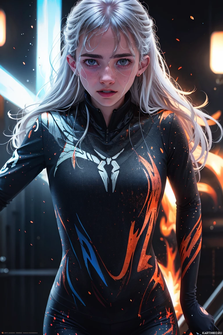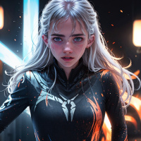 dark tones that contrast with her suit, which might suggest a setting of nighttime or underground. There are also some flame-like patterns around her, which could imply she has abilities related to fire or is somehow associated with it within the context of this image. The overall style of the artwork seems to be influenced by comic book or graphic novel illustrations, characterized by clean lines and vibrant colors that emphasize the heroic or superhero aspect of the character's appearance.