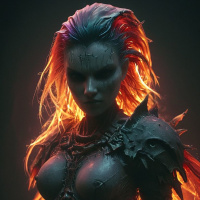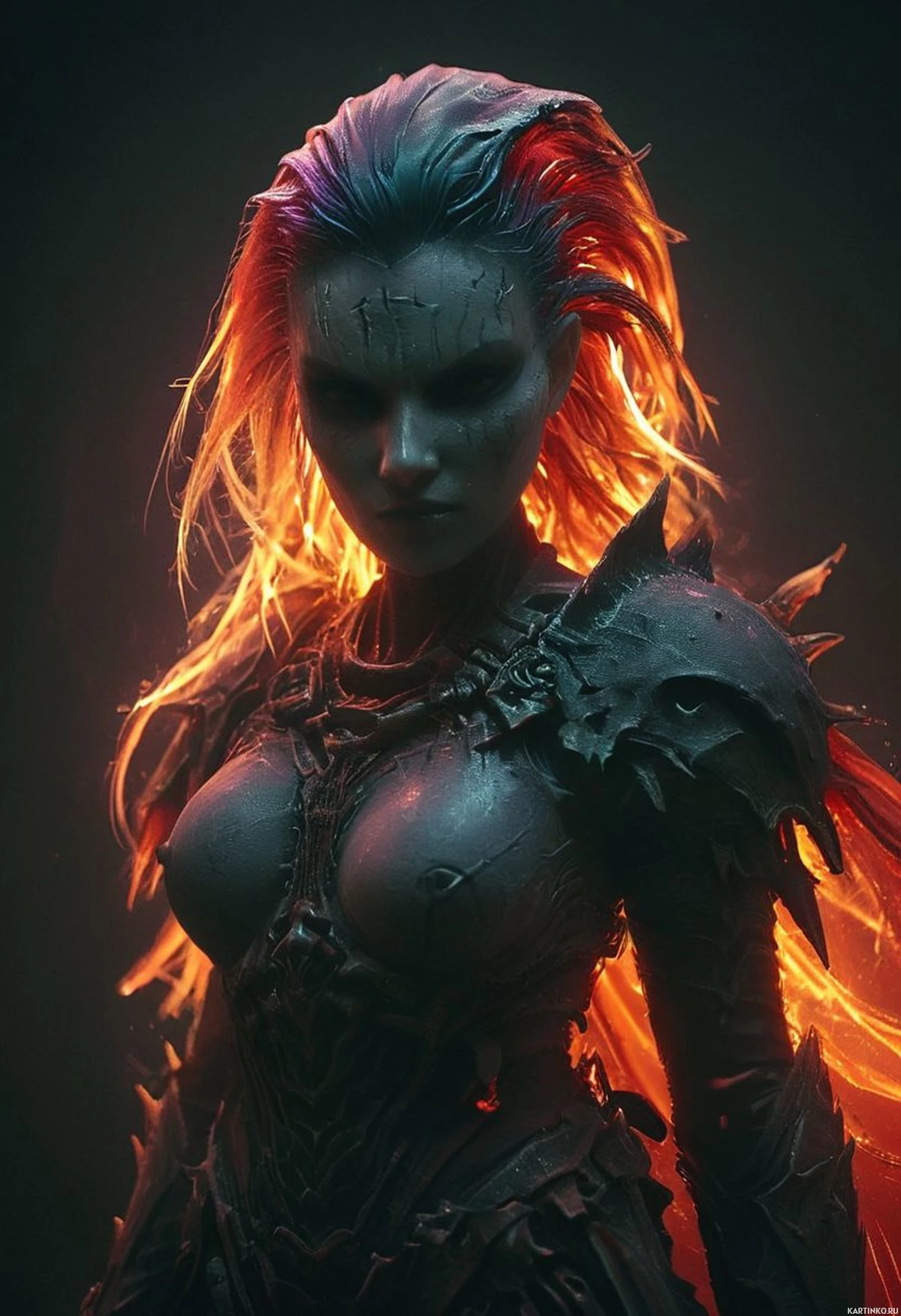 The image shows a character that appears to be from a fantasy setting. The character has striking red hair with an ombre effect, transitioning into blue at the ends. Their eyes are a glowing yellow and they have a pale complexion. They are wearing a dark armor or outfit with spiky accents and a metallic texture. There's a noticeable detail on their face that resembles a scar or tattoo-like mark on the right side of their face. The background is nondescript, featuring a gradient from light to dark, which might be interpreted as a fiery or intense atmosphere.