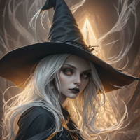 The image portrays a female character with white hair, dressed in a witch hat and garments commonly associated with fantasy archetypes. She is positioned against a dramatic backdrop of dark shades, possibly suggesting a nighttime setting or an ominous atmosphere. Her expression is serious, adding to the mystical or enigmatic ambiance of the artwork.