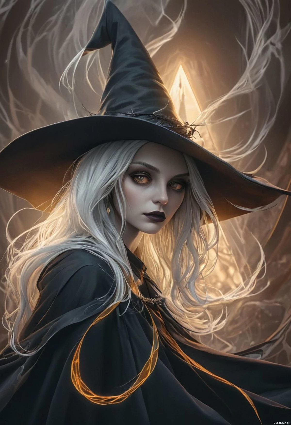 На картинке изображена девушка с белыми волосами, в колпаке ведьмы и одежде, характерной для персонажей фэнтези. На заднике – мрачные тона, возможно, указывающие на ночное время или зловещую атмосферу. Её выражение лица серьезное, что добавляет картине таинственности.