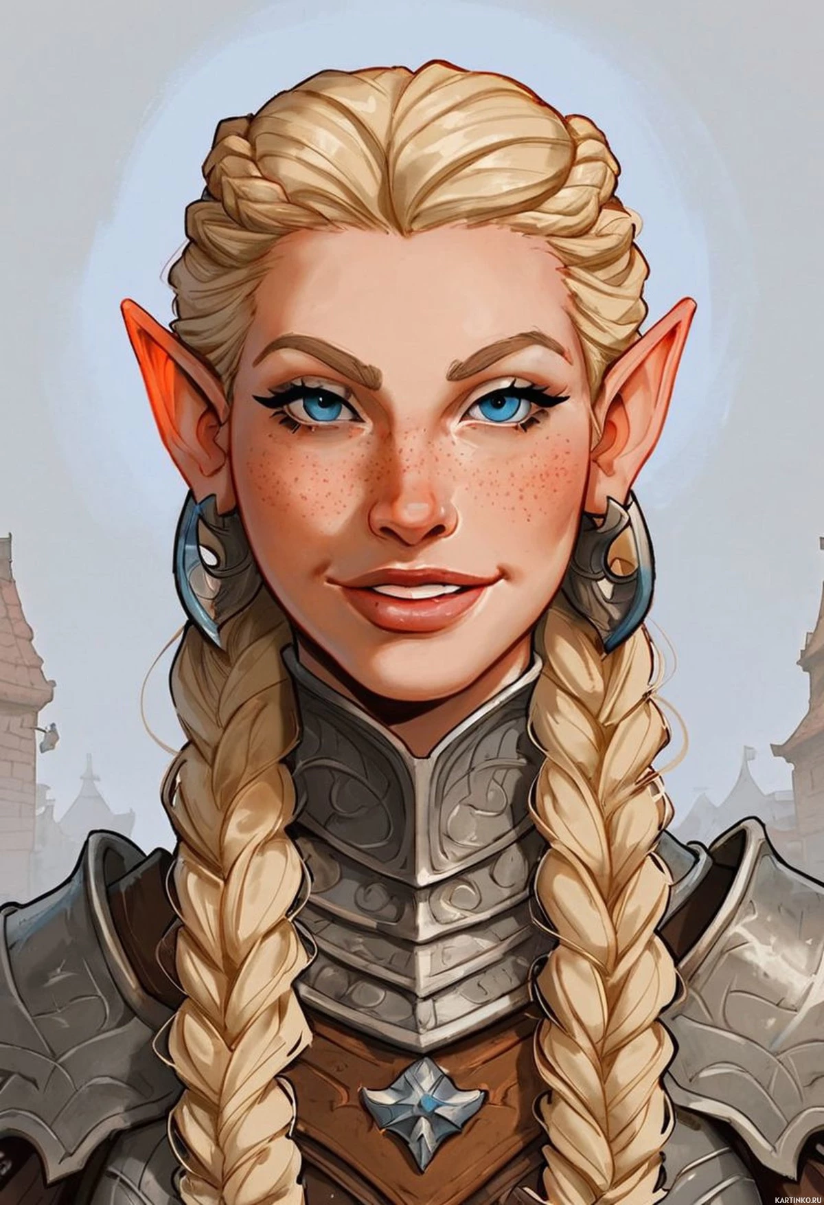 The image features a fantasy-style female character with blonde hair styled in braids, blue eyes, and pointed ears indicative of an elf. She has a neutral expression on her face and is wearing silver armor adorned with gold accents and a high collar. The armor also includes a star symbol on the chest.