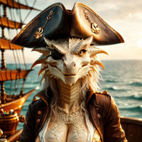 На картинке изображено антропоморфное существо, похожее на русалку, стоящее на палубе корабля в море. У персонажа человеческие черты лица с заостренными ушами, заметный хвост и чешуя на шее и груди. Она одета в пиратский костюм: треуголка, длинный плащ с золотой отделкой, жилет, бриджи и сапоги. В руках у нее пистолет, направленный вниз. На заднем плане простирается океан, а над ним видны облака и заходящее солнце.