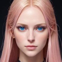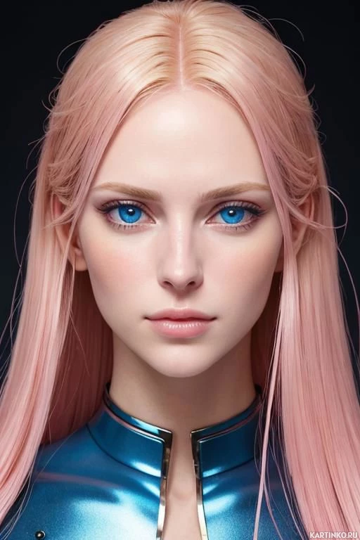 На картинке запечатлена молодая женщина с розовыми волосами. У неё нейтральное выражение лица, она смотрит прямо в камеру. Волосы у неё выпрямлены и доходят до плеч. Фон картинки едва различим, так как большую часть кадра занимает девушка. На ней одежда, напоминающая металлический комбинезон или доспехи, с голубыми оттенками. Свет на лице мягкий, он подчеркивает черты лица, не создавая резких теней.