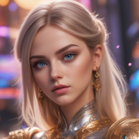 На картинке изображена женщина со светлыми волосами, собранными в высокую прическу, и макияжем с яркими синими тенями и нейтральным оттенком губ. На ней серебряные доспехи или нагрудник, украшенные сложным металлическим орнаментом. На нагруднике встроено несколько драгоценных камней, и на правом ухе видно серьгу. Фон предполагает городскую обстановку с неоновой подсветкой и темным переулком.