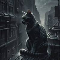На картинке — черный кот с серыми отметинами, примостившийся на старой, обветшалой выступе здания. Он словно смотрит влево. На заднем плане – мрачный городской пейзаж с узкими переулками и полуразрушенными строениями, создающими ощущение заброшенного, урбанистического места. Идет дождь, добавляющий картинке атмосферности.