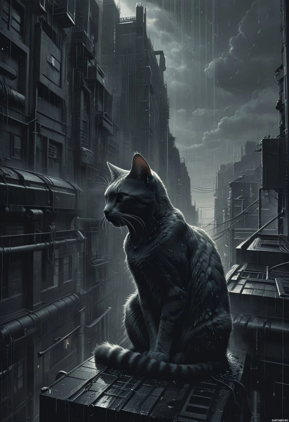 коты | Фотки и рисунки с котом | Cats | Городской пейзаж в дождливый день с кошкой