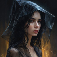На картинке изображена женщина с печальным выражением лица. У нее темные волосы и светлая кожа. На ней большая черная накидка, ниспадающая на плечи и частично открывающая верхнюю часть тела. Под накидкой, похоже, она одета в темный корсет или одежду с кружевными элементами. Фон намекает на хаотичную или разрушенную войной обстановку – там видны огонь и разрушения. Ее взгляд направлен в сторону, от зрителя, что придает ее выражению отстраненность и задумчивость.