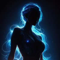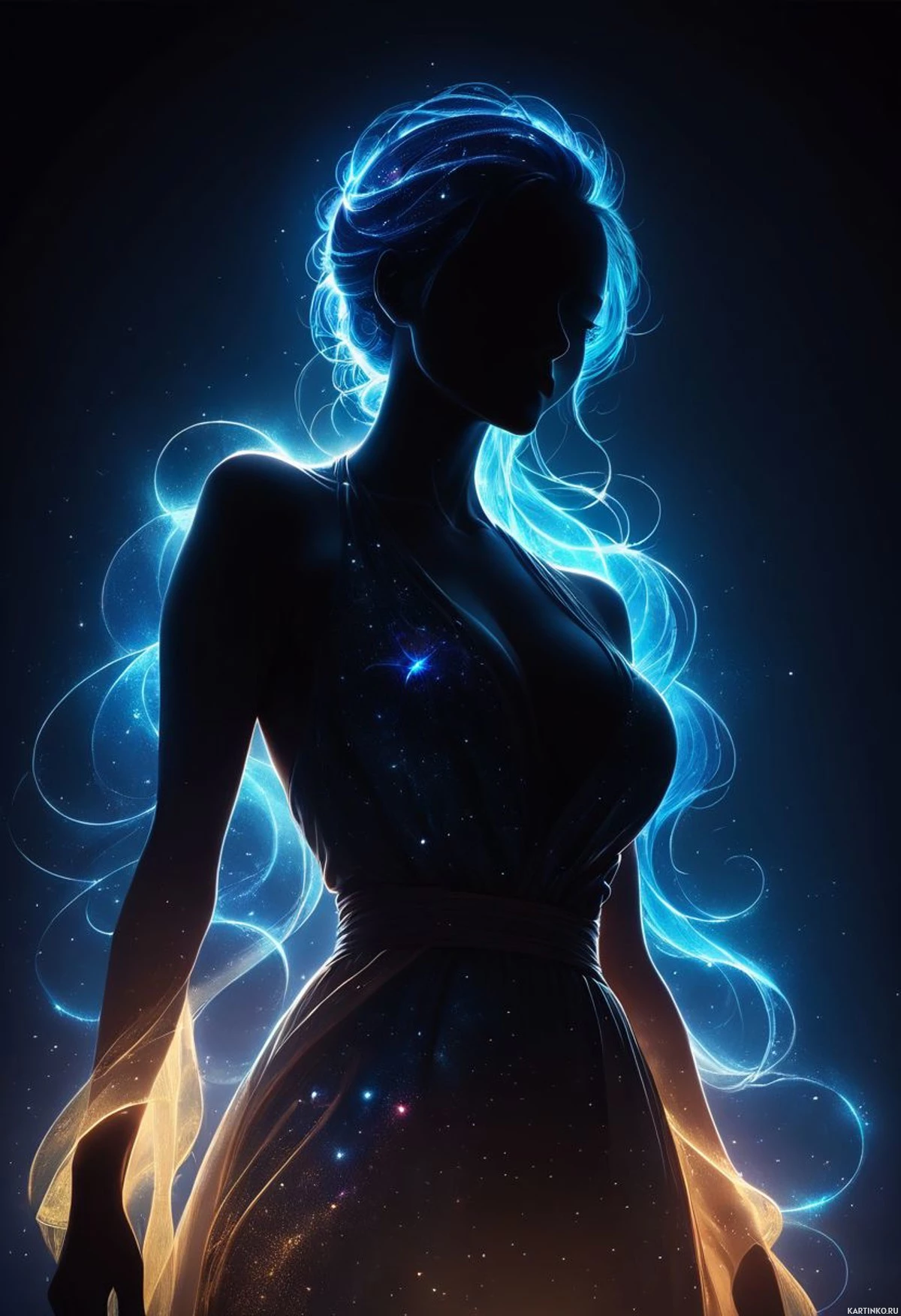 На картинке изображена девушка с длинными, струящимися голубыми волосами, ниспадающими на спину и плечи, создавая силуэт на фоне звездного неба. На ней развевается, кажется, неземное или космическое платье, сочетающееся по цвету с её волосами, переходящее от темных оттенков в верхней части к более светлому голубому внизу. Стиль картинки указывает на принадлежность к жанрам фэнтези или научной фантастики.