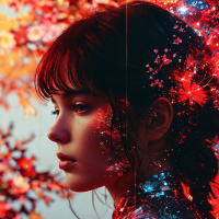 The image depicts a young woman with dark hair styled in an updo. She has a serious expression on her face and appears to be looking slightly to the right of the frame. Her facial features are symmetrical, with a defined nose and full lips. Her complexion is fair, and she has dark eyes that are visible. Her attire includes a dark jacket or top with high collar, which suggests a modern style. The background features a gradient from a reddish-brown hue at the bottom to a lighter tone at the top. There appears to be an abstract pattern or motif above her head, resembling a cosmic phenomenon such as stars or nebulae, rendered in shades of red and white. The lighting is soft and evenly distributed, enhancing the contours of her face without creating harsh shadows. The overall composition of the image has a surreal quality due to the juxtaposition of the woman's realistic features with the imaginary cosmic backdrop.