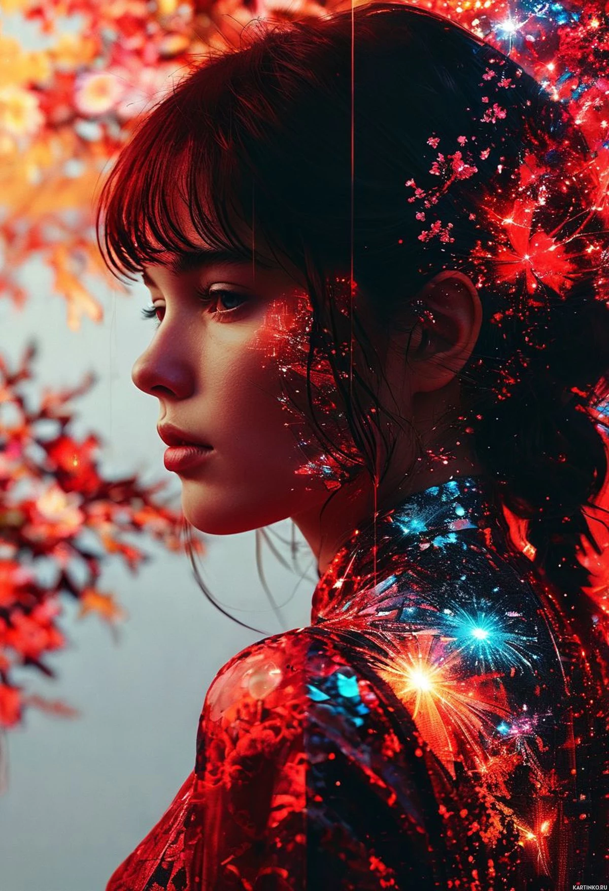 На картинке изображена молодая женщина с темными волосами, собранными в пучок. На ее лице серьезное выражение, и она смотрит немного вправо от кадра. Черты лица симметричны, с четко очерченным носом и полными губами. У нее светлый тон кожи и темные глаза. На ней темный жакет или топ с высоким воротником, что говорит о современном стиле. Фон переходит от красно-коричневого оттенка внизу к более светлому вверху. Над ее головой виден абстрактный узор, напоминающий космическое явление, например, звезды или туманности, выполненный в оттенках красного и белого. Освещение мягкое и равномерное, подчеркивающее контуры лица без резких теней. Общая композиция картинки имеет сюрреалистичный характер благодаря сопоставлению реалистичных черт женщины и фантастического космического фона.