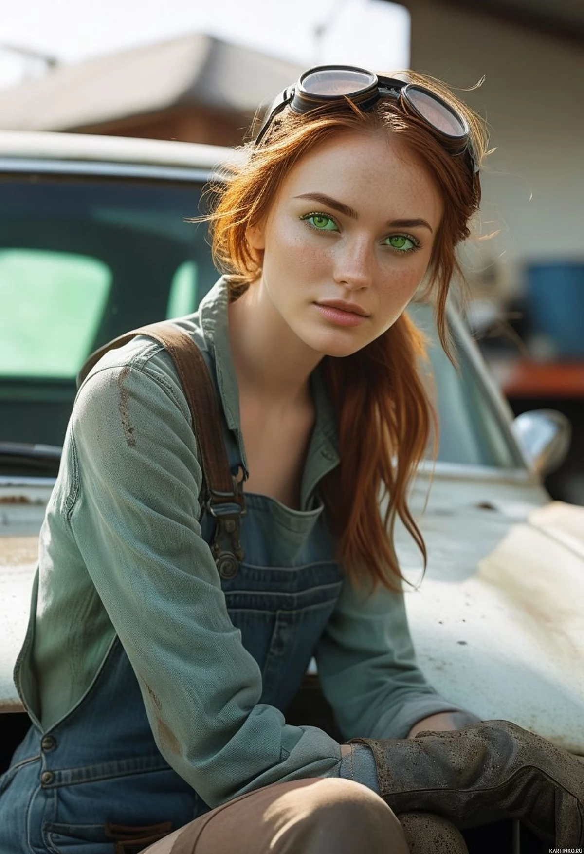 На картинке запечатлена молодая женщина с рыжими волосами, позирующая для фотографии. У нее светлая кожа, и, кажется, на лице макияж, включающий тени, тушь и помаду. Ее волосы волнистые и ниспадают на плечи. Она смотрит прямо в камеру с нейтральным выражением лица. Она одета в повседневном стиле, на ней джинсовый комбинезон с лямками, что указывает на смелый или вдохновленный винтажем модный выбор. Ее наряд дополняют солнцезащитные очки "авиаторы", надетые на голову. На заднем плане виден старый, ржавый грузовик, который создает атмосферу уличной обстановки и усиливает непринужденную, винтажную эстетику фотографии. Освещение предполагает, что это день, и на сцену падает естественный солнечный свет.