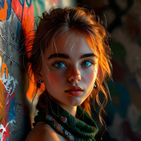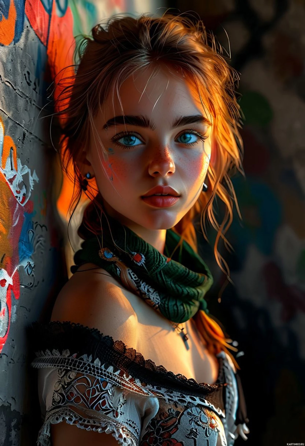 На картинке – рыжеволосая девушка в шарфе, на ней корсет и черная кофточка. Задний план выглядит как заброшенное или промышленное пространство, что видно по облупившейся краске на стене. На стене разбросаны яркие наклейки, оживляющие и без того приглушенные цвета. Она смотрит прямо в камеру с невозмутимым выражением лица.