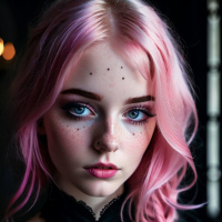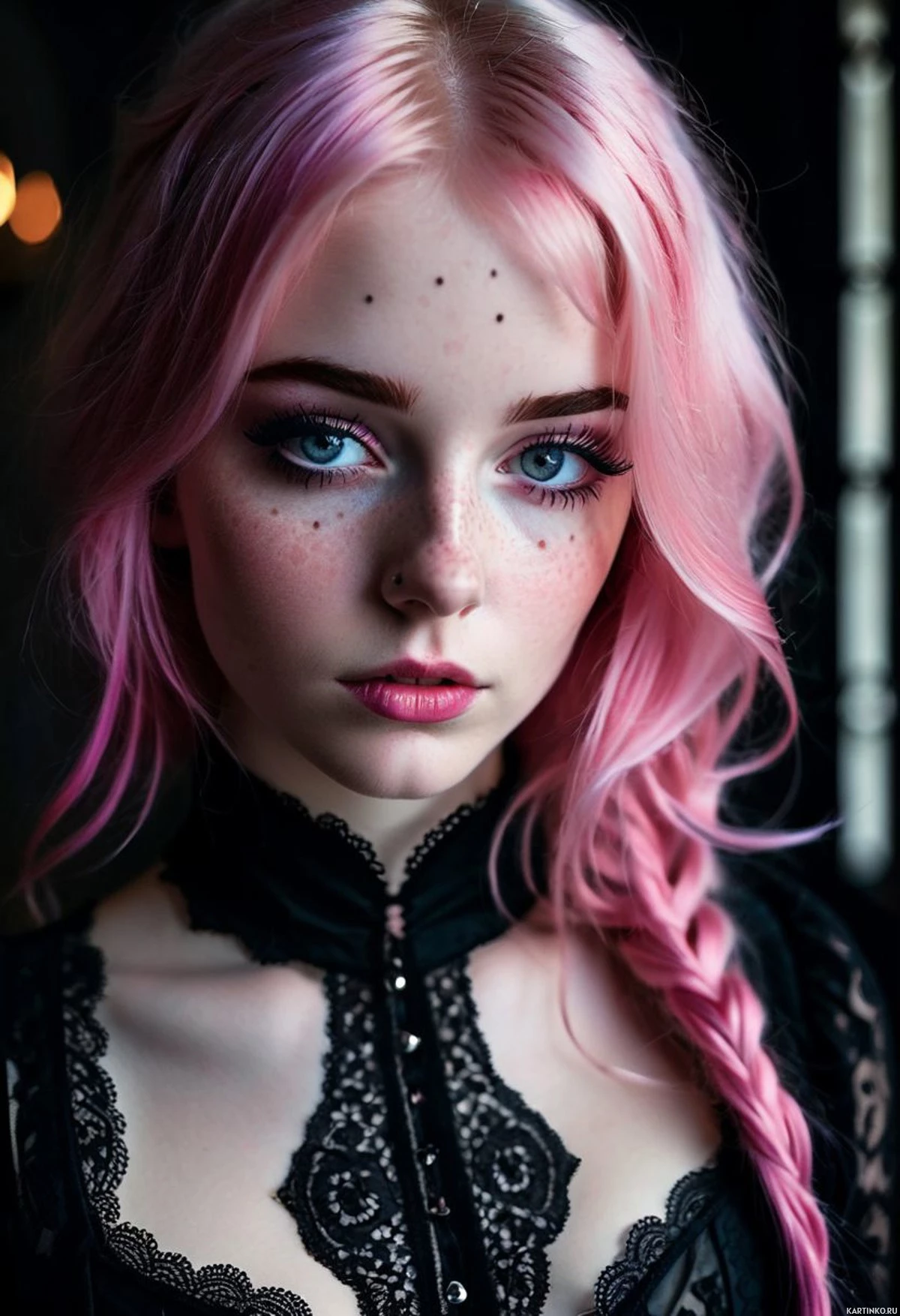 The image features a young woman with pink hair styled into a braided hairstyle. Her makeup is dramatic, with prominent blue eyeshadow and contoured cheeks that give her a somewhat unhealthy appearance. She has a neutral expression on her face. The lighting in the photo is soft, highlighting her fair complexion and the shine on her hair. The woman is wearing what appears to be a black lace or lingerie-style garment with some embellishments that resemble metal studs or adornments.