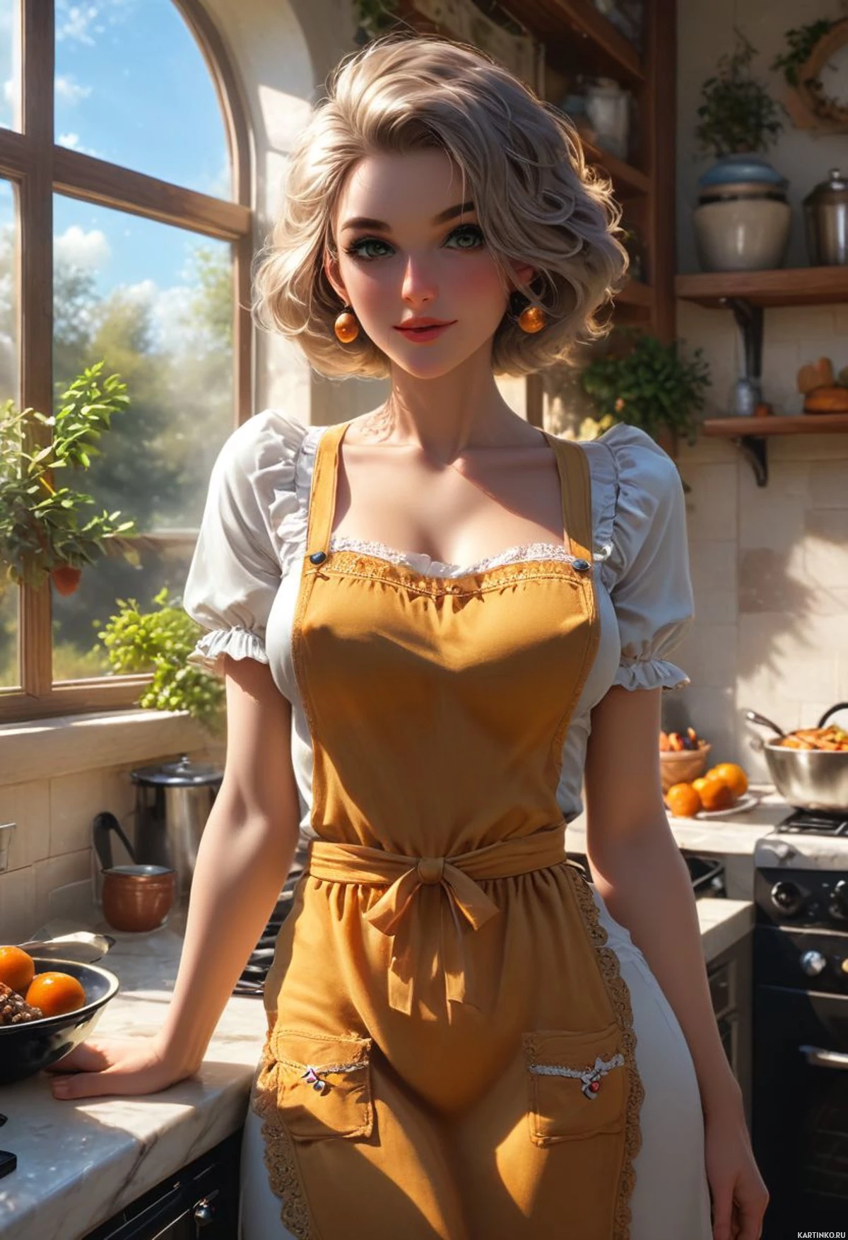 На картинке запечатлена молодая женщина, стоящая, по всей видимости, на кухне. У нее светлые волнистые волосы, макияж подчеркивает глаза, щеки и губы с глянцевым эффектом. На ней желтый фартук поверх светлого платья, желтые подтяжки и жемчужное ожерелье. Одна рука покоится на кухонном столе, другая – на бедре. Она смотрит прямо в камеру с расслабленной позой. На заднем плане видны различные кухонные предметы: кастрюли, сковородки, миска, предположительно, с фруктами (возможно, апельсинами), и деревянная ложка, лежащая в кастрюле. Также виден арка, напоминающий дверной проем, ведущий в другую зону, возможно, на улицу, что подтверждается естественным светом, проникающим внутрь. В целом стиль картинки напоминает винтажные иллюстрации, с мягкими тенями и гладкими текстурами. Цвета теплые, преобладает желтая гамма, которая гармонирует с нарядом женщины.