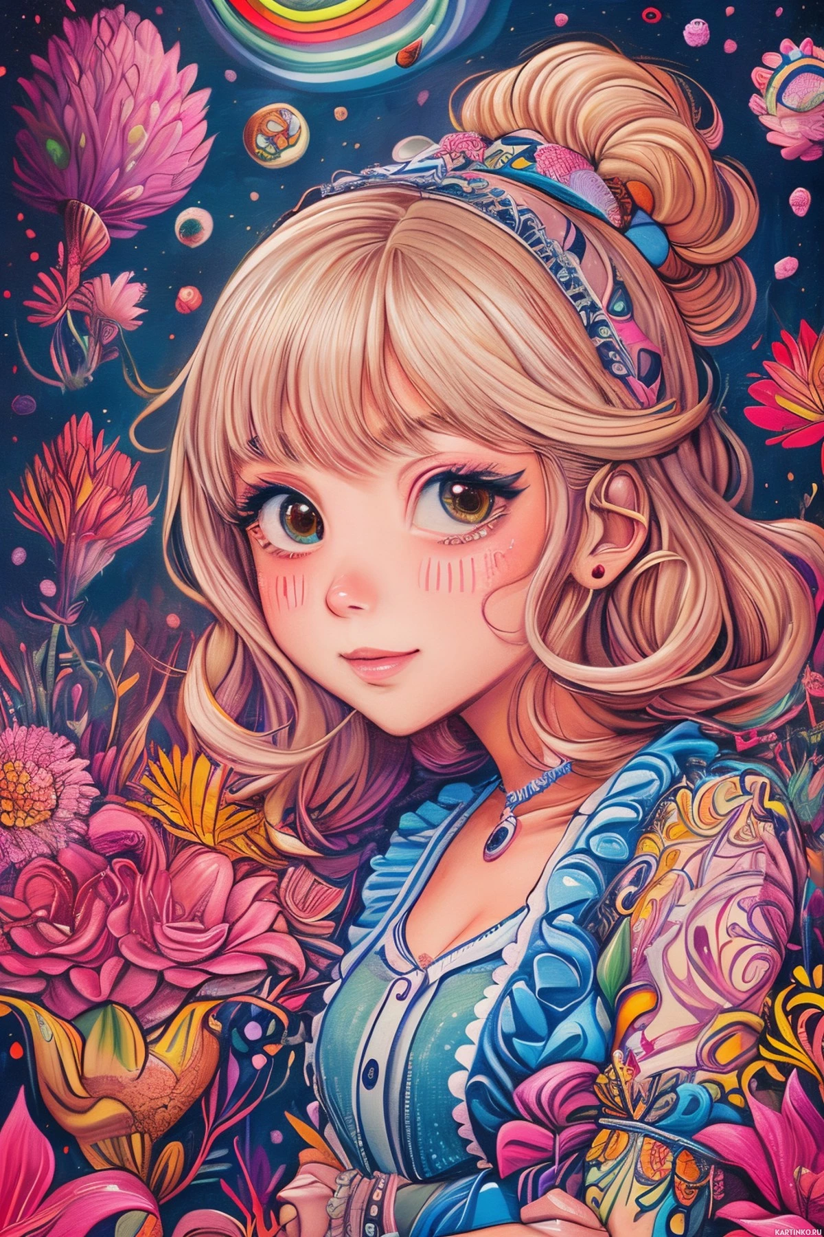 The image features a girl with blonde hair styled in twin tails. She has pink eyes and is adorned with what appears to be a floral headband. The girl is wearing an outfit with a blue bodice, a yellow skirt, and has a crown of flowers on her head. The background consists of vibrant colors and various flowers surrounding her.
