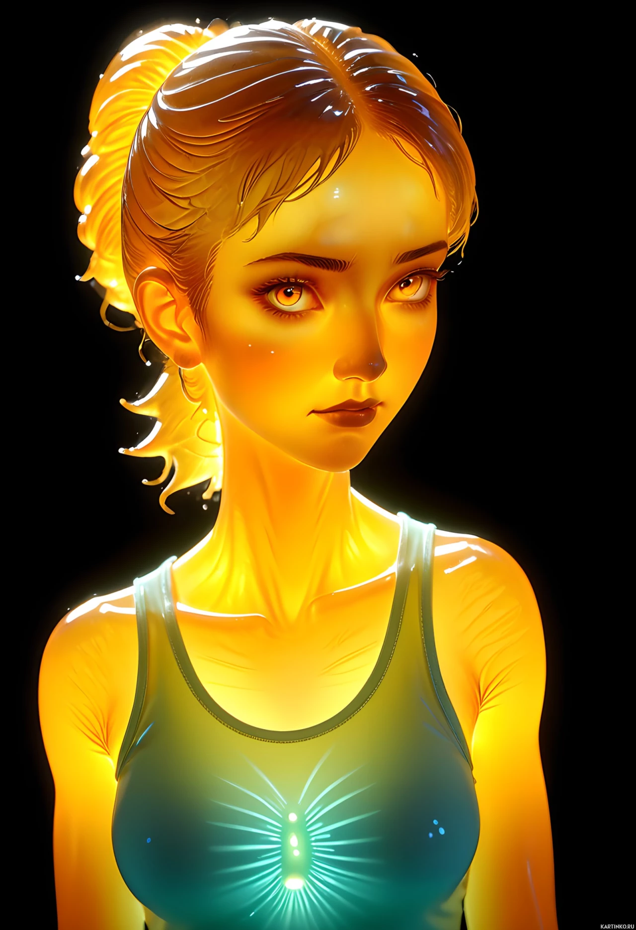 The image depicts a character with an ethereal quality, possibly from a video game or animation. The character has stylized features such as large expressive eyes and what appears to be an inner glow or energy emanating from the chest area. This could suggest a power or magic-related ability in the context of the story this character inhabits. The character is wearing a dark green top that shows some cleavage, with a white undershirt visible underneath. The lighting casts shadows on the sides of the face and around the eyes, which contributes to the dramatic effect.