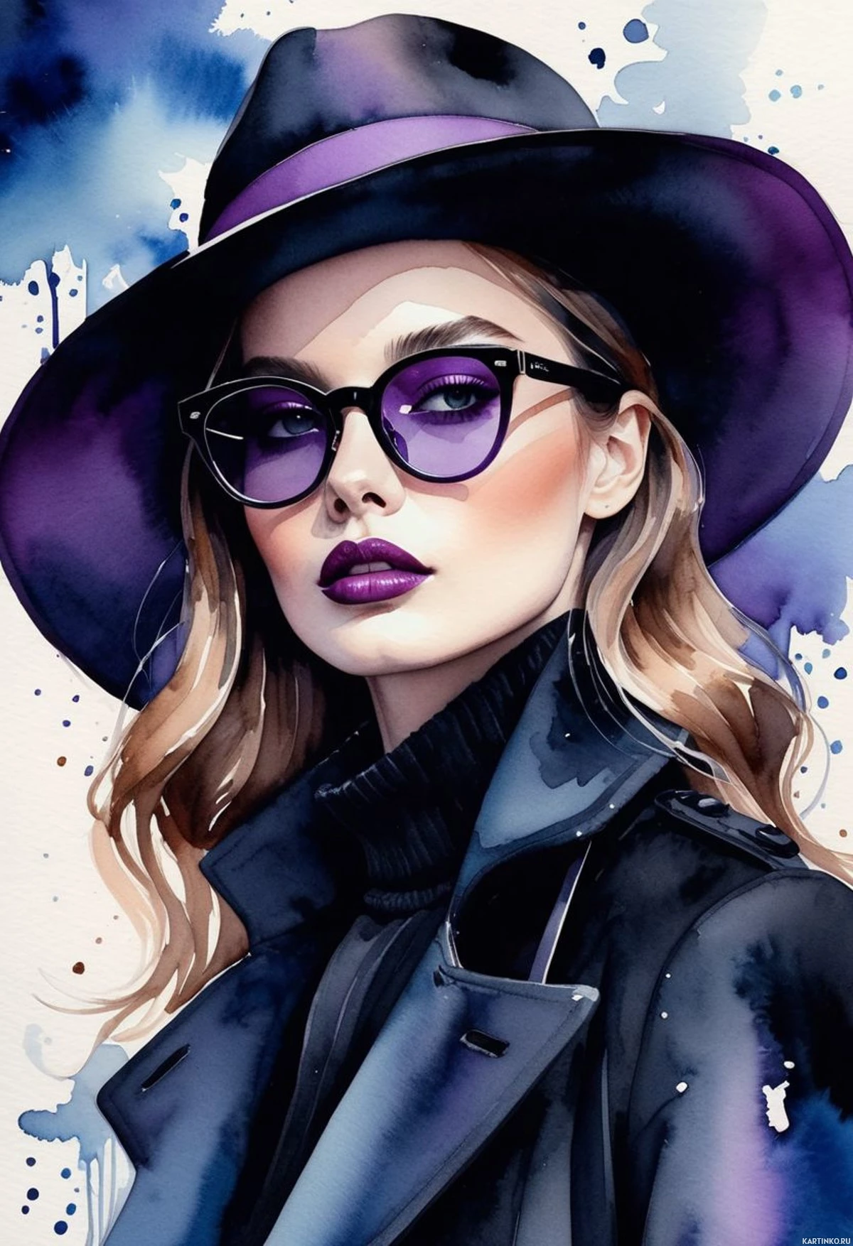 На картинке – молодая женщина, она в центре внимания. На ней фиолетовая фетровая шляпа и солнцезащитные очки на носу. Одета она в черное пальто с высоким воротником и кожаную куртку под ним. На заднем плане – яркий синий фон, возможно, имитирующий городской пейзаж или абстрактный узор.