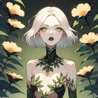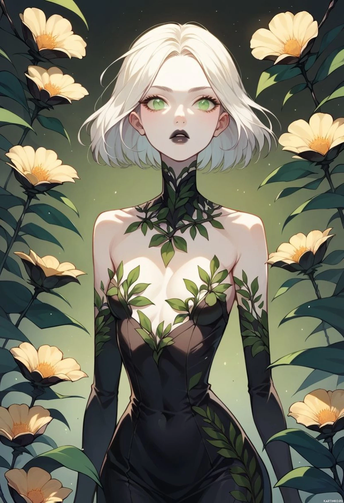 На картинке изображен персонаж, похоже, женщина с белыми волосами и выразительными зелеными глазами. У неё стильный, дерзкий образ: она одета в черный боди с корсетом, украшенный темными, сложными цветочными узорами, напоминающими листья. Костюм с высоким вырезом и длинными рукавами придает ему одновременно элегантный и бунтарский вид. Вокруг персонажа – цветы в полном расцвете, с желтыми лепестками, которые выделяются на темном фоне. Судя по внешнему виду, это могут быть как дикие, так и культивированные сорта, добавляющие нотку природы в изображение, выполненное в стилизованной манере. Общая цветовая гамма темная, с зелеными акцентами, создающими мрачную и загадочную атмосферу. Стиль рисунка предполагает, что это может быть иллюстрация из графического романа, комикса или видеоигры, учитывая ее стилизованный вид.