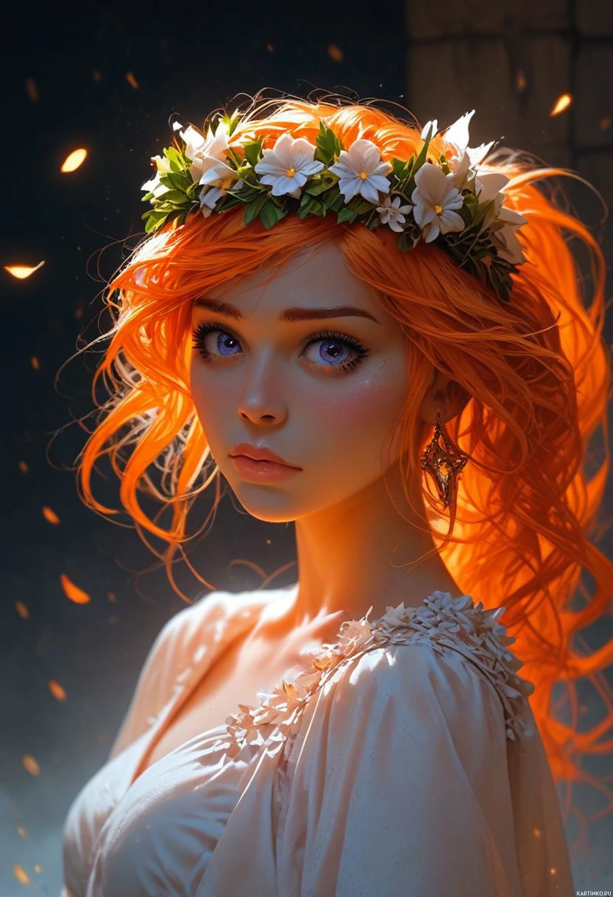 На картинке изображена молодая женщина с ярко-рыжими волосами, ниспадающими на плечи. На ней сложный головной убор, украшенный белыми цветами, что придает картине сказочный характер. Её наряд выполнен в стиле древности или мифологии, возможно, намекая на персонажа из мифа или фэнтезийной истории. Фон темный и зловещий, с сиянием, которое может представлять портал или волшебный вход. Вокруг её головы искры, усиливающие неземную атмосферу картинки. Композиция акцентирует внимание на центральной фигуре, создавая ощущение драмы и загадочности.