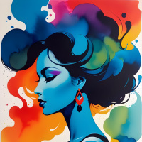 The image features a person with their eyes closed, wearing makeup that includes blue and black colors on the face and neck area. They have long hair that is dyed to match the color scheme of the background. The background consists of brightly colored paint splatters in various hues such as red, yellow, orange, pink, green, and more. The overall style of the image appears to be artistic or conceptual, with a focus on vibrant colors and expressive makeup.